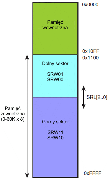 Możliwe jest skonfigurowanie różnych stanów oczekiwania dla różnych adresów pamięci zewnętrznej. Przestrzeń adresową pamięci zewnętrznej można podzielić na dwa sektory, które posiadają osobne bity stanów oczekiwania. Bity SRL2, SRL1 i SRL0 wybierają podział tych sektorów, co pokazano na poniższym rysunku i w tabelce. Standardowo bity SRL2, SRL1 i SRL0 są ustawione na zero i cała przestrzeń adresowa pamięci zewnętrznej traktowana jest jako jeden sektor. W tym przypadku takty oczekiwania są konfigurowane przez bity SRW11 i SRW10.