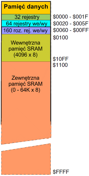 Poniższy rysunek pokazuje organizację pamięci SRAM w ATmega64: