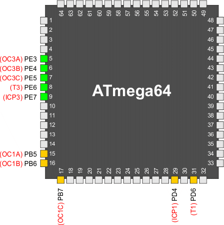 Końcówki portów współpracujące z timerami/licznikami 1 i 3 w mikrokontrolerze ATmega64 są następujące:
