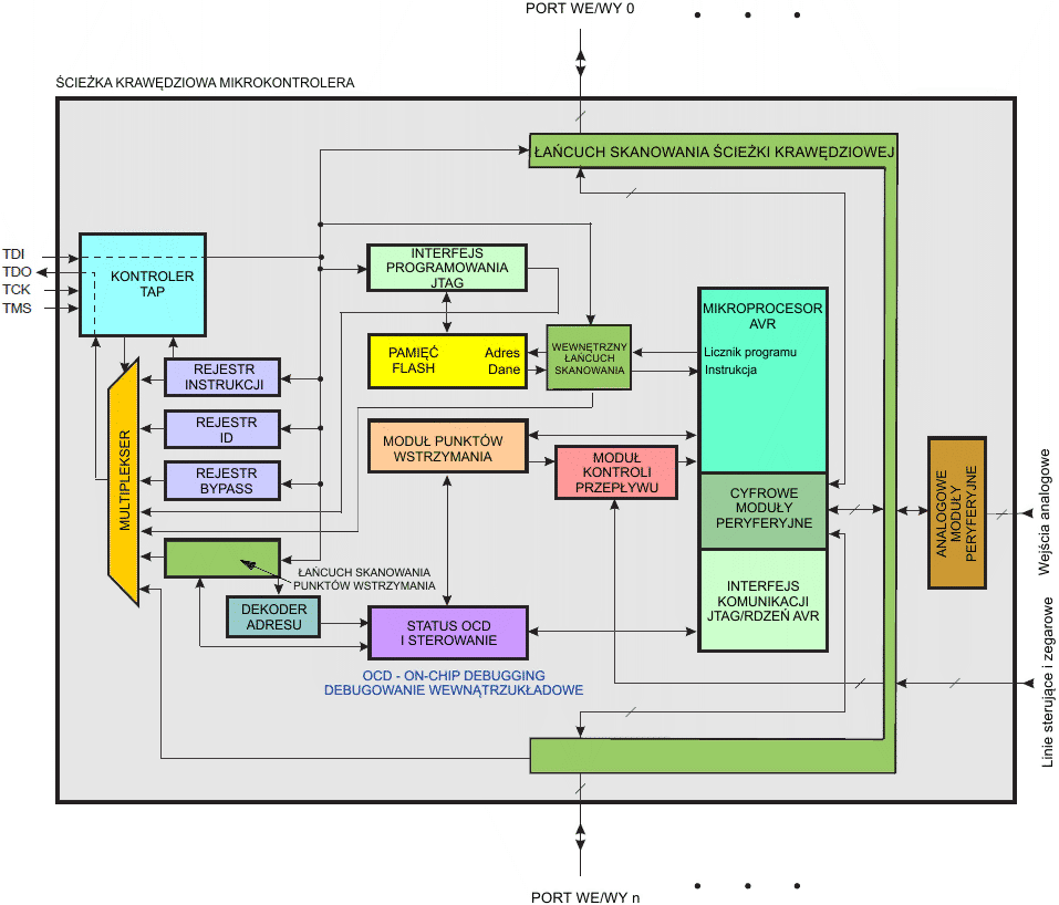 Poniższy rysunek pokazuje schemat blokowy interfejsu JTAG oraz wbudowanego systemu debugowania.
