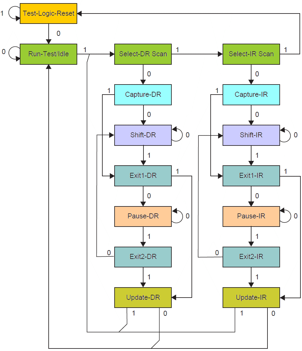 Kontroler TAP jest 16-stanowym automatem skończonym, który steruje działaniem obwodu skanowania ścieżki krawędziowej, obwodu programowania JTAG lub wbudowanym systemem debugowania. Przejścia stanów zilustrowane na powyższym rysunku zależą od sygnału obecnego na końcówce TMS (pokazanego obok każdego przejścia stanu) w czasie narastającego zbocza na końcówce TCK. Stanem początkowym po resecie przy włączeniu zasilania (ang. Power-On Reset) jest stan Test-Logic-Reset.