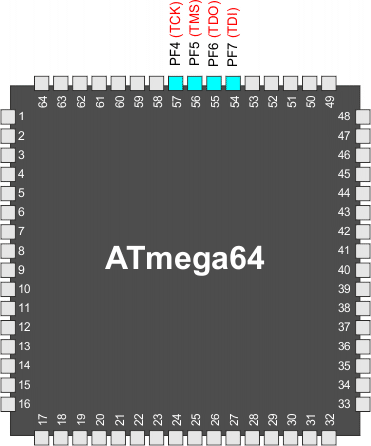 Gdy bit bezpiecznikowy JTAGEN nie jest zaprogramowany, to te cztery końcówki TAP są normalnymi końcówkami portu, a kontroler TAP znajduje się w stanie resetu. Gdy bit ten zostanie zaprogramowany i bit JTD w rejestrze MCUCSR jest wyzerowany, to linie sygnałowe TAP zostają podciągnięte wewnętrznie do stanu wysokiego, a JTAG włącza się do skanowania ścieżki krawędziowej i programowania. W tym przypadku końcówka wyjściowa TAP (TDO) staje się wiszącą bez podłączenia w stanach, w których kontroler TAP nie przesuwa danych i z tego powodu musi być podłączona do opornika podciągającego lub innego urządzenia wyposażonego w oporniki podciągające (na przykład wejścia TDI następnego mikrokontrolera w łańcuchu skanowania). Mikrokontroler sprzedawany jest z zaprogramowanym bitem bezpiecznikowym JTAGEN.
