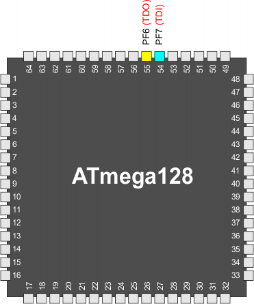 Końcówka TDO pozostaje w stanie niepodłączonym, gdy włączony jest interfejs JTAG, a kontroler JTAG TAP nie przesuwa danych. Jeśli układ sprzętowy połączony z końcówką TDO nie podciągnie w górę poziomu logicznego, to pobór prądu zwiększy się. Zauważ, iż końcówka TDI dla następnego układu w łańcuchu skanowania zawiera opornik podciągający, który eliminuje ten problem. Zapis jedynką bitu JTD w rejestrze MCUCSR lub pozostawienie w stanie niezaprogramowanym bitu bezpiecznikowego JTAGEN wyłączy interfejs JTAG.