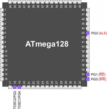 TOSC1, Końcówka 1 oscylatora timera: Gdy bit AS0 rejestru ASSR zostanie ustawiony w celu włączenia asynchronicznego taktowania timera/licznika 0, to końcówka PG4 jest odłączana od portu i staje się odwracającym wyjściem wzmacniacza oscylatora. W tym trybie do tej końcówki podłączony jest oscylator kwarcowy, a sama końcówka nie może być używana jako końcówka we/wy.