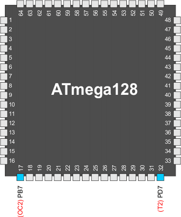 Ogólna funkcja portu we/we zostaje przejęta przez wyjście Output Compare (OC2) z generatora przebiegu, jeśli dowolny z bitów COM2[1:0] jest ustawiony. Jednakże kierunek końcówki OC2 (wejście lub wyjście) jest wciąż kontrolowany przez rejestr kierunku danych (DDR) dla tej końcówki portu. Bit portu kierunku danych dla końcówki OC2 (DDR_OC2) musi być ustawiony jako wyjście, zanim wartość OC2 stanie się widoczna na końcówce. Funkcja przejmowania jest niezależna od trybu pracy generatora przebiegu.