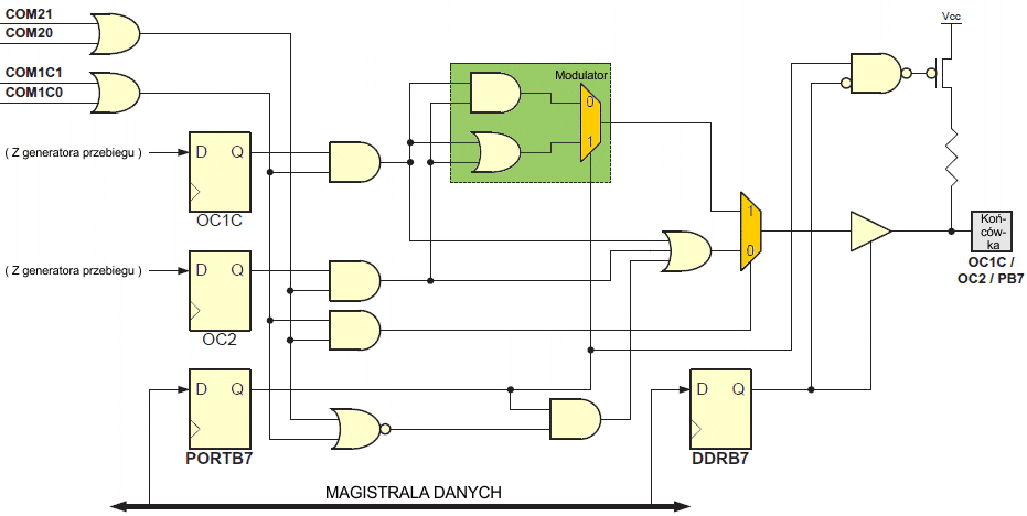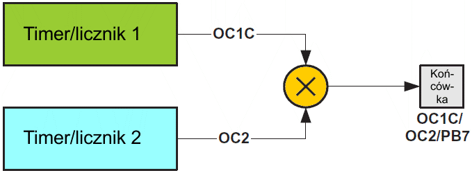 Poniższy rysunek przedstawia zastępczy schemat funkcjonalny modulatora. Schemat ten zawiera część modułów timerów/liczników oraz drajwer wyjściowy końcówki 7 portu B.
