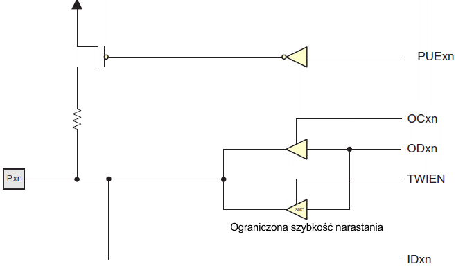 Obwód skanowania ścieżki krawędziowej z poprzedniego rysunku zastępuje zielony obszar ograniczony kreskowaną linią. Jeśli nie jest obecna żadna alternatywna funkcja portu, to dane wejściowe ID odpowiadają wartości rejestru PINxn (lecz ID nie ma synchronizatora), dane wyjściowe OD odpowiadają rejestrowi PORT, sterowanie wyjściem OC odpowiada rejestrowi kierunku danych DD, a włączanie podciągania POExn odpowiada wyrażeniu logicznemu PUD · DDxn · PORTxn.