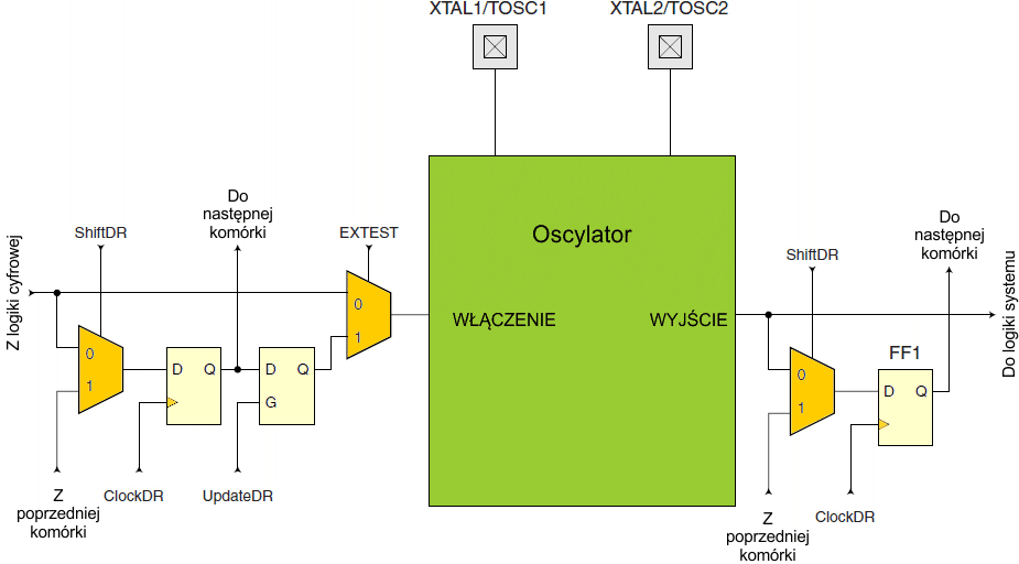 Poniższy rysunek pokazuje, jak każdy oscylator z zewnętrznym połączeniem jest wspierany w łańcuchu skanowania.