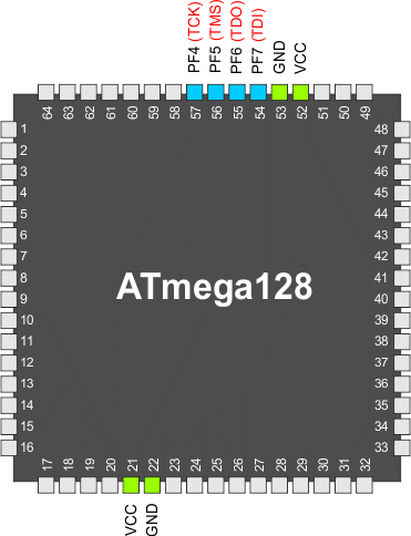 Programowanie mikrokontrolera AVR poprzez JTAG wykonywane jest przy pomocy 4-końcówkowego portu JTAG: TCK, TMS, TDI i TDO. Są to jedyne końcówki, które muszą być sterowane przy wykonywaniu programowania JTAG (dodatkowo do końcówek zasilania). Nie ma potrzeby zastosowania zewnętrznie napięcia 12V. Aby uaktywnić port dostępu testowego JTAG (ang. JTAG Test Access Port), bit bezpiecznikowy JTAGEN musi być zaprogramowany oraz należy wyzerować bit JTD w rejestrze MCUCSR.