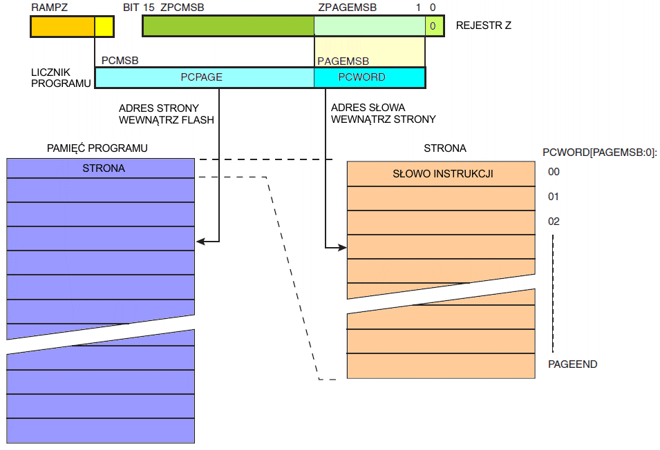 Ponieważ pamięć FLASH jest zorganizowana w strony, to licznik programu (ang. Program Counter) można potraktować tak, jakby składał się z dwóch różnych sekcji. Jedna sekcja składająca się z najmniej znaczących bitów adresuje słowa wewnątrz strony, natomiast bity najbardziej znaczące adresują te strony. Pokazane to jest na poniższym rysunku. Zauważ, że operacje wymazywania strony (ang. page erase) i zapisu strony (ang. page write) używają osobnych adresów. Dlatego jest bardzo ważne, aby oprogramowanie boot-loadera adresowało tę samą stronę w obu tych operacjach. Gdy rozpocznie się programowanie, adres zostaje zapamiętany i wskaźnik Z/RAMPZ może być użyty z innymi operacjami.