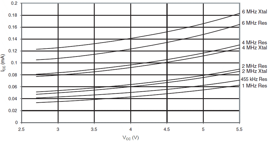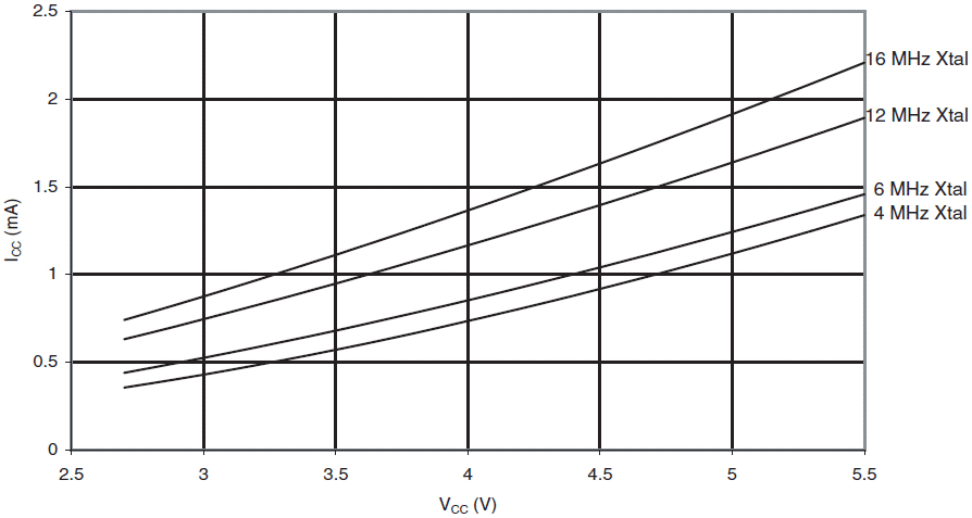 Poniższe wykresy ukazują typowe zachowanie się mikrokontrolera. Danych tych nie testowano podczas produkcji. Wszystkie pomiary poboru prądu dokonano przy wszystkich końcówkach we/wy skonfigurowanych jako wejścia z włączonymi wewnętrznymi opornikami podciągającymi. Jako źródło zegarowe użyto generatora sinusoidalnego z wyjściem typu rail-to-rail.