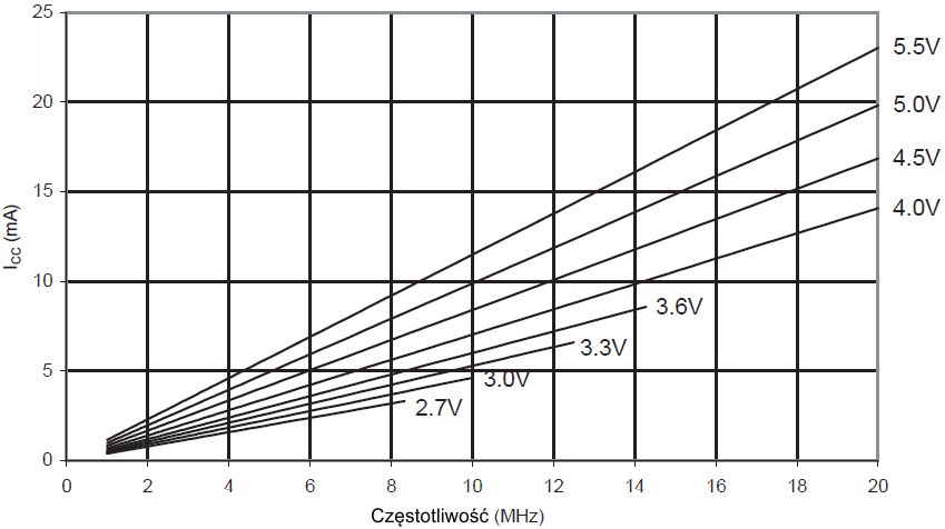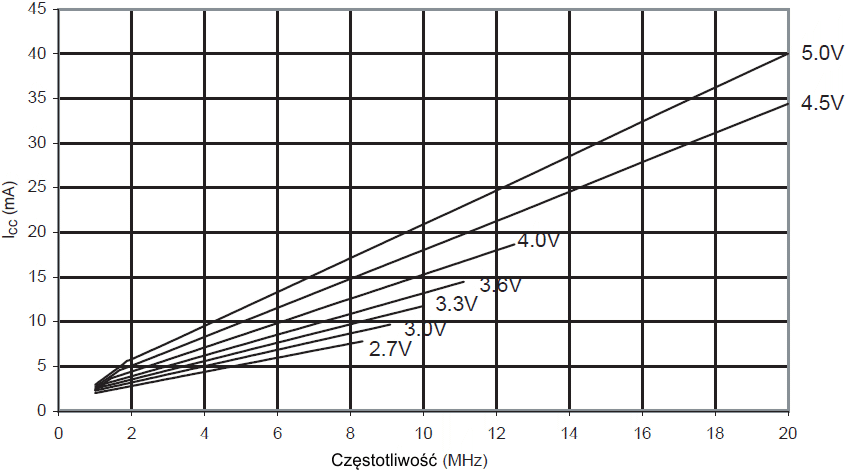 ![]() gdzie: CL = obciążająca pojemność VCC = napięcie robocze f = średnia częstotliwość przełączania końcówki we/wy |