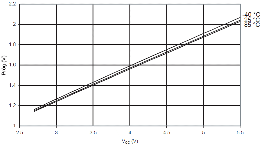 Napięcie progowe końcówki wejściowej we/wy w funkcji napięcia zasilającego VCC