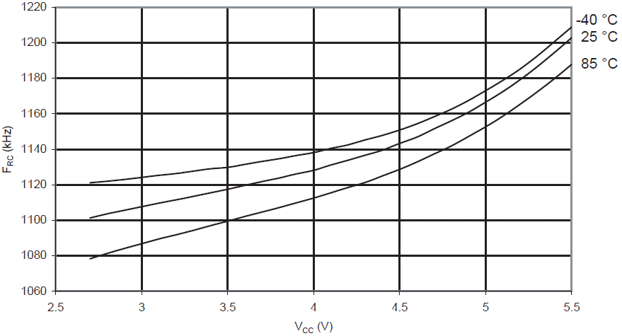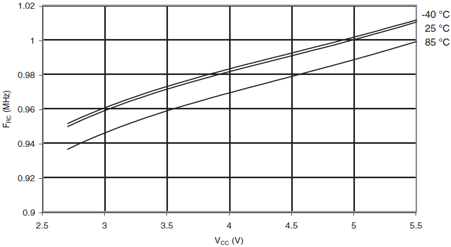 Częstotliwość kalibrowanego oscylatora RC 1MHz w funkcji VCC