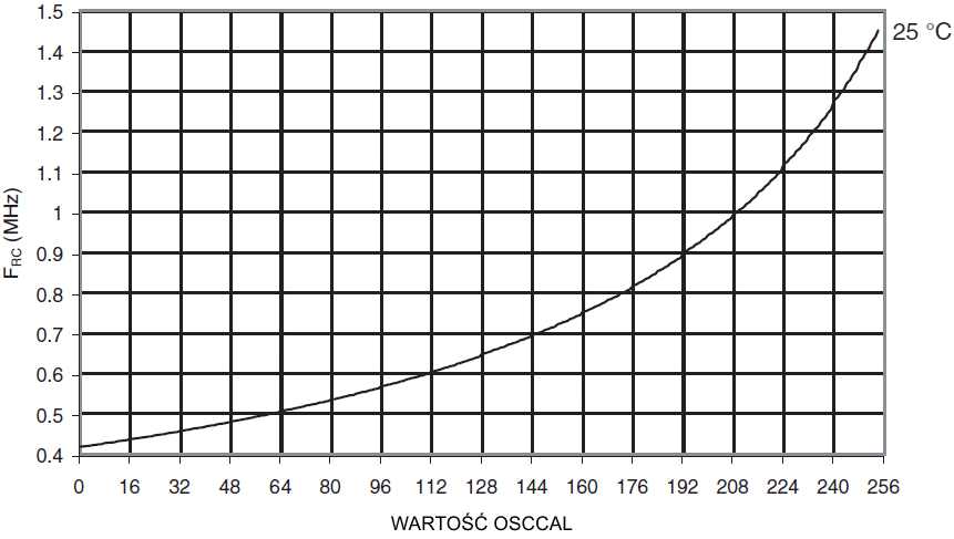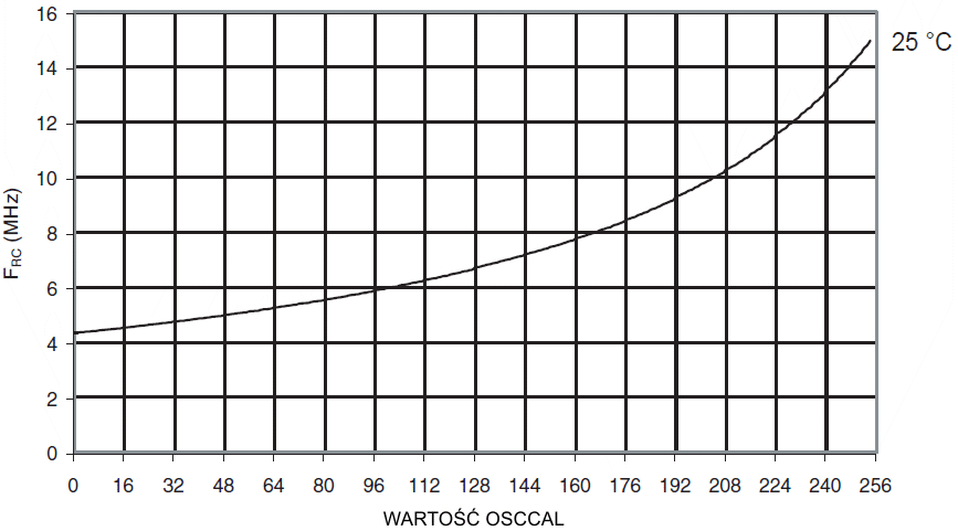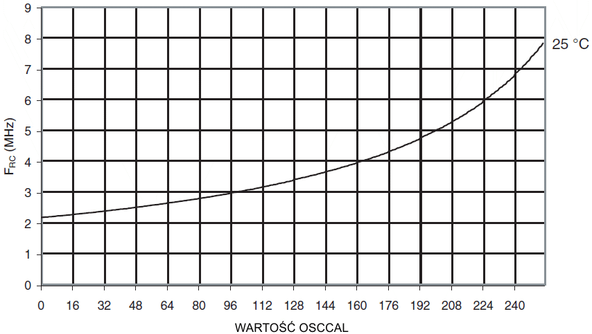 Częstotliwość kalibrowanego oscylatora RC 8MHz w funkcji wartości rejestru