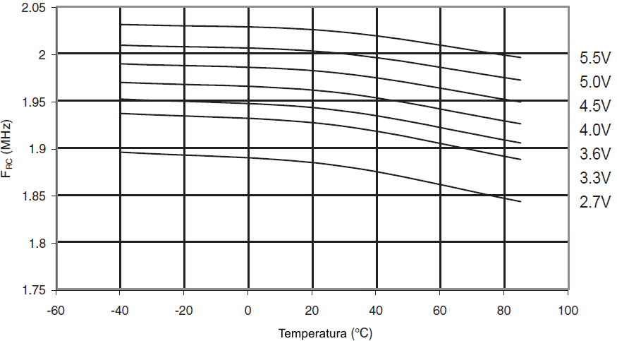 Częstotliwość kalibrowanego oscylatora RC 2MHz w funkcji temperatury