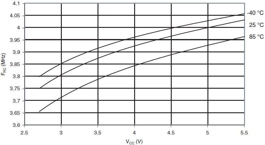 Częstotliwość kalibrowanego oscylatora RC 4MHz w funkcji VCC