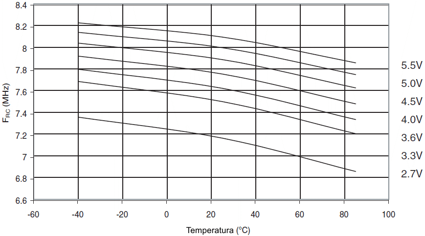 Częstotliwość kalibrowanego oscylatora RC 8MHz w funkcji temperatury