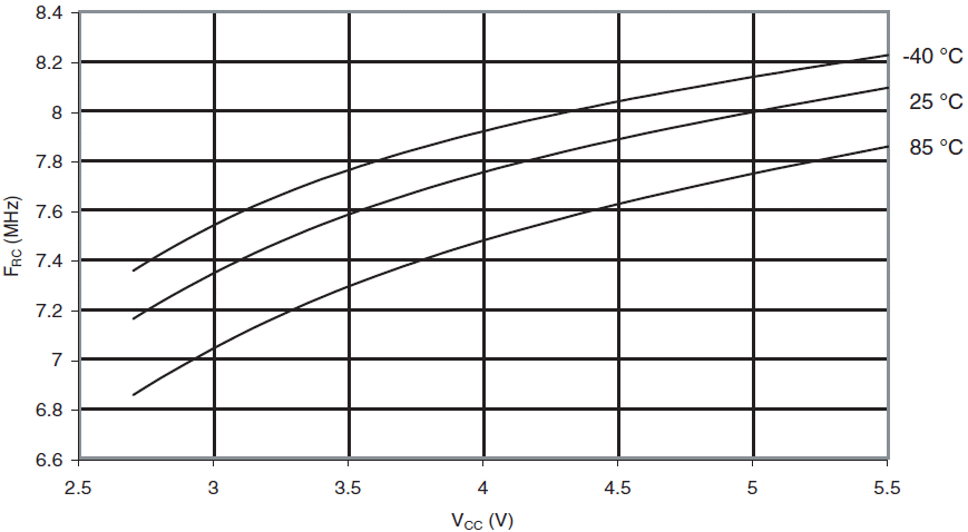 Częstotliwość kalibrowanego oscylatora RC 8MHz w funkcji VCC