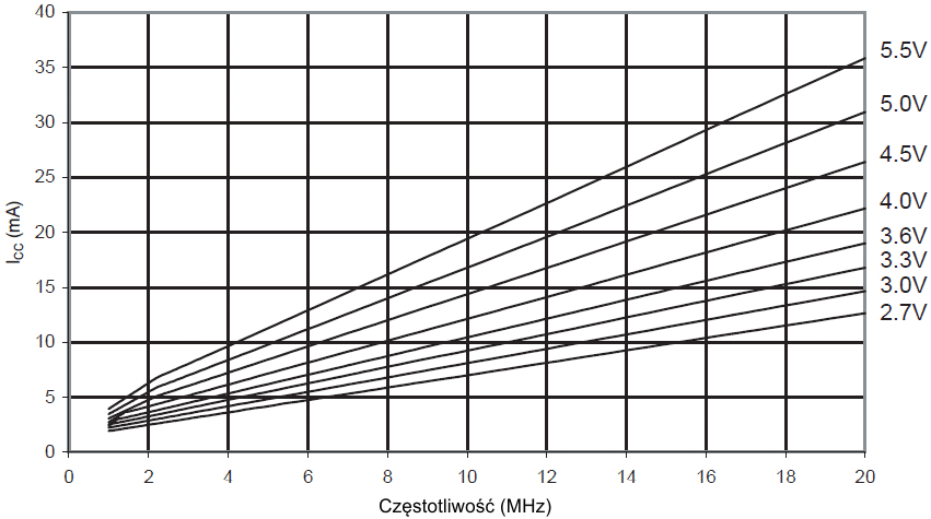 Pomiary charakterystyk są wykonywane przy częstotliwościach wyższych niż ograniczenia testowe. Nie gwarantuje się poprawnej pracy mikrokontrolera przy przekroczeniu maksymalnych częstotliwości pracy określanych przez kod zamówienia.