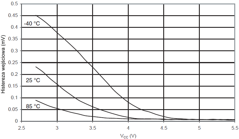 Histereza wejściowa końcówki we/wy w funkcji napięcia zasilającego VCC