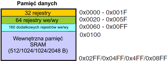 Układ ATmega48A/PA/88A/PA/168A/PA/328/P jest złożonym mikrokontrolerem posiadającym więcej modułów we/wy niż można obsłużyć przy pomocy 64 komórek we/wy, dostęp do których został zarezerwowany w kodach operacyjnych instrukcji IN i OUT. W rozszerzonej przestrzeni we/wy od 0x60 do 0xff można używać tylko instrukcji ST/STS/STD i LD/LDS/LDD. Dolne 768/1280/1280/2303 komórki pamięci danych zawierają rejestry robocze. pamięć we/wy, rozszerzoną pamięć we/wy oraz wewnętrzną pamięć danych SRAM. Pierwsze 32 komórki są rejestrami roboczymi, następne 64 komórki są standardową pamięcią we/wy, dalej jest 160 komórek rozszerzonej pamięci we/wy, a kolejne 512/1024/1024/2048 komórek tworzy wewnętrzną pamięć danych SRAM.
