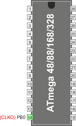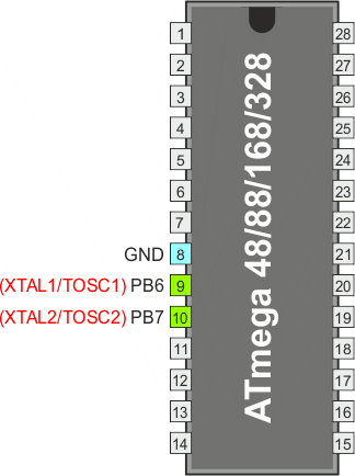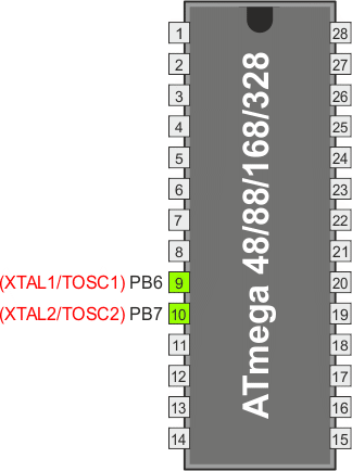 Mikrokontroler ATmega48A/PA/88A/PA/168A/PA/328/P współdzieli końcówki oscylatora timera/licznika (TOSC1 i TOSC2) z XTAL1 i XTAL2. Gdy jest używany ten oscylator timera/licznika, zegar systemowy musi posiadać częstotliwość cztery razy większą od częstotliwości oscylatora. Z tego powodu oscylator timera/licznika można używać tylko wtedy, gdy wybrano kalibrowany, wewnętrzny oscylator RC jako źródło zegara systemowego.