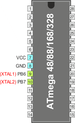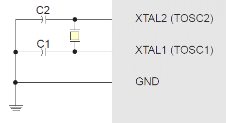 Końcówki XTAL1 i XTAL2 są odpowiednio wejściem i wyjściem odwracającego wzmacniacza, który można skonfigurować jako wewnątrzukładowy oscylator, jak na poniższym rysunku.