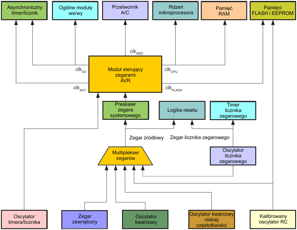 Zegar we/wy używany jest przez większość modułów we/wy, jak timery/liczniki, SPI i USART. Jest on również używany przez moduł przerwań zewnętrznych, lecz zwróć uwagę, iż niektóre przerwania zewnętrzne są wykrywane przez obwody asynchroniczne, co pozwala wykrywać te przerwania nawet przy zatrzymanym zegarze we/wy. Również zauważ, iż rozpoznawanie adresu w module TWI jest wykonywane asynchronicznie, gdy zegar clkI/O został zatrzymany, co umożliwia odbiór adresów TWI we wszystkich trybach uśpienia.