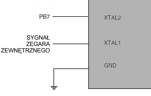 Aby taktować mikrokontroler zewnętrznym źródłem zegarowym, końcówka XTAL1 powinna być sterowana zgodnie z poniższym rysunkiem. Bity bezpiecznikowe CKSEL należy w tym przypadku zaprogramować na wartość "0000".