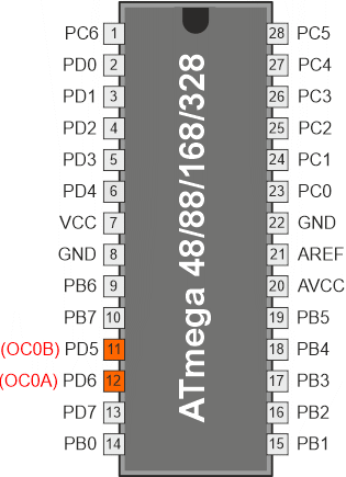Ustawienie bitów COM0x1:0 na 2 utworzy nieodwrócony przebieg PWM, a odwrócony przebieg PWM może zostać wygenerowany przez ustawienie bitów COM0x1:0 na 3: ustawienie bitów COM0A1:0 na 1 umożliwia zmianę stanu końcówki OC0A przy zgodnościach porównań, jeśli jest ustawiony bit WGM02. Opcja ta jest niedostępna dla końcówki OC0B. Faktyczna wartość OC0x pojawi się na końcówce portu tylko wtedy, gdy końcówka ta zostanie ustawiona jako wyjście. Przebieg PWM jest generowany przez ustawianie (lub zerowanie) rejestru OC0x przy zgodności porównania pomiędzy OCR0x i TCNT0, a zerowanie (lub ustawianie) rejestru OC0x w cyklu zegara timera, w którym licznik jest zerowany (zmienia wartość z TOP na BOTTOM).