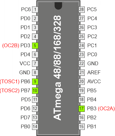 Ogólna funkcja portu we/we zostaje przejęta przez wyjście porównania (OC2x) z generatora przebiegu, jeśli dowolny z bitów COM2x1:0 jest ustawiony. Jednakże kierunek końcówki OC2x (wejście lub wyjście) jest wciąż kontrolowany przez rejestr kierunku danych (DDR) dla tej końcówki portu. Bit portu kierunku danych dla końcówki OC2x (DDR_OC2x) musi być ustawiony jako wyjście, zanim wartość OCx2 stanie się widoczna na końcówce. Funkcja przejmowania jest niezależna od trybu pracy generatora przebiegu.