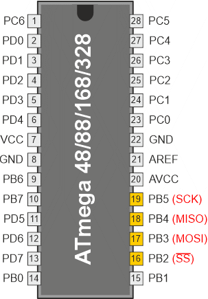 Peryferyjny interfejs szeregowy (ang. Serial Peripheral Interface, SPI) pozwala na synchroniczny transfer danych z dużą prędkością pomiędzy mikrokontrolerem ATmega48A/PA/88A/PA/168A/PA/328/P a urządzeniami peryferyjnymi lub pomiędzy kilkoma mikrokontrolerami AVR. Schemat blokowy modułu SPI jest przedstawiony na poniższym rysunku: