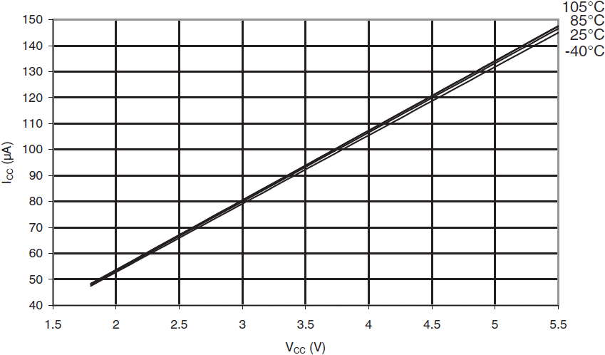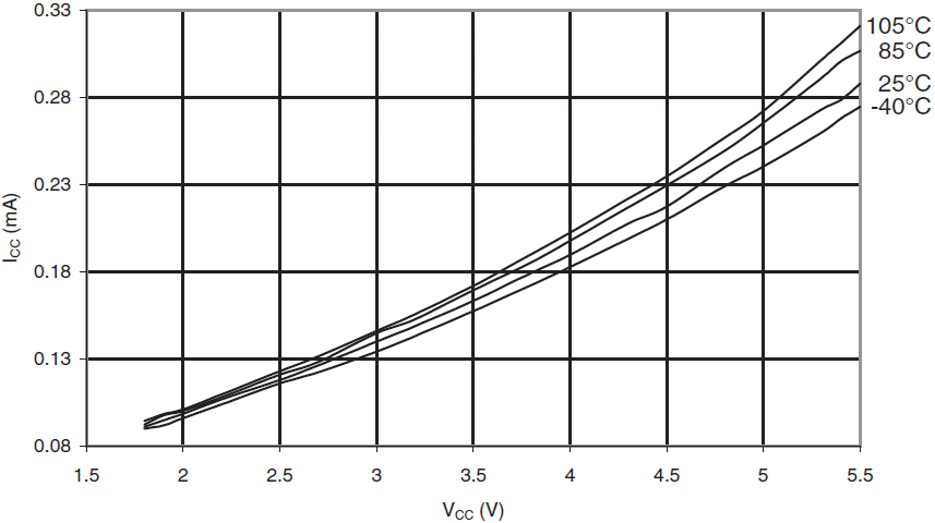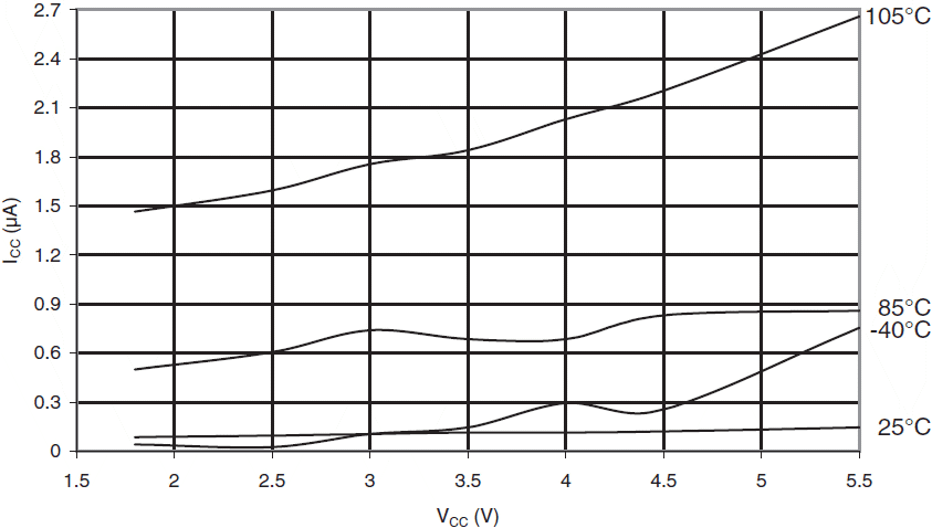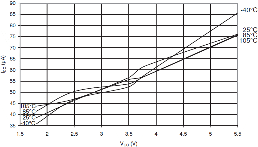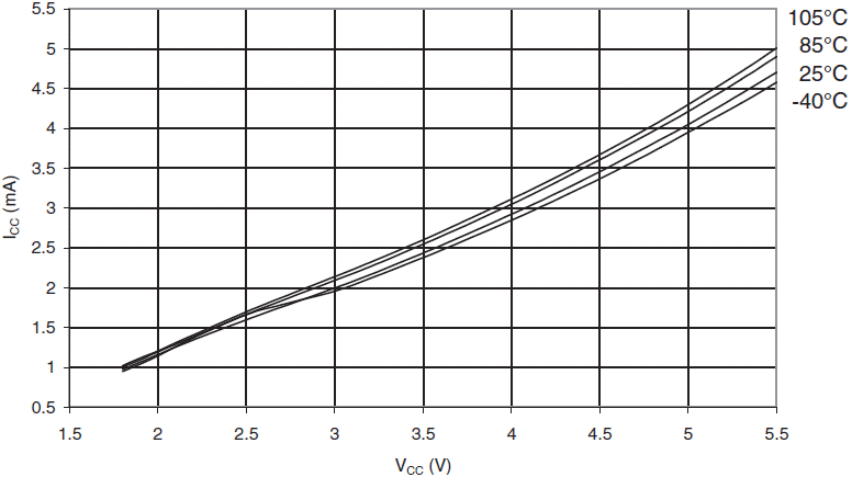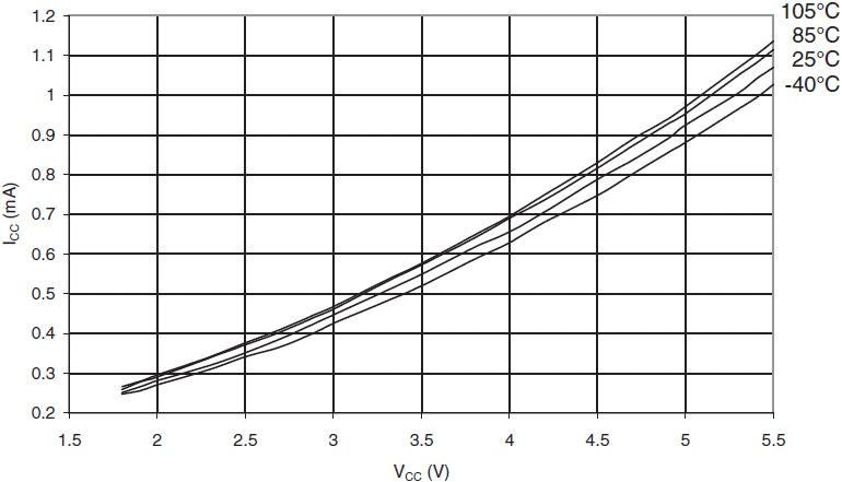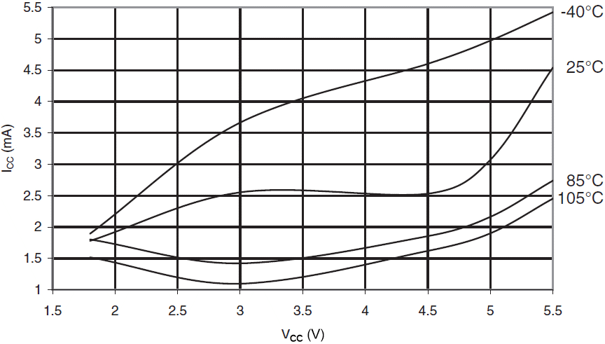 Rys.88 ATmega48PA: Prąd komparatora analogowego w funkcji VCC