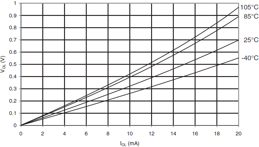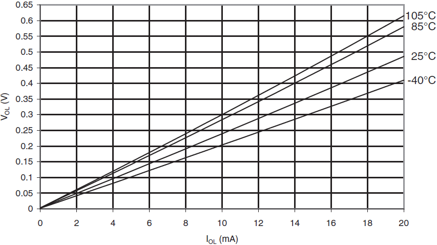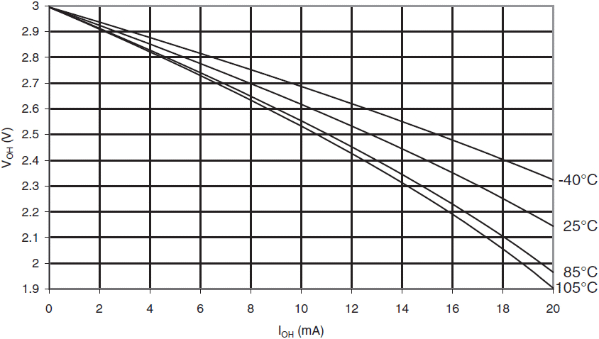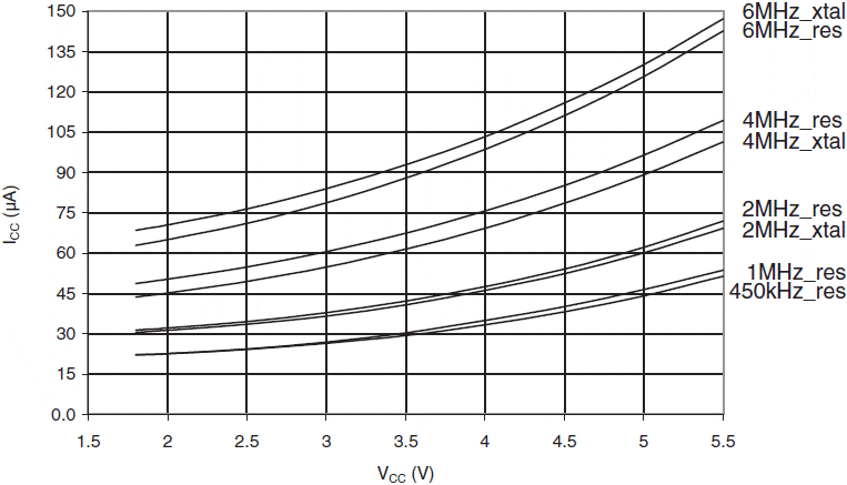 Poniższe wykresy ukazują typowe zachowanie się mikrokontrolera. Danych tych nie testowano podczas produkcji. Wszystkie pomiary poboru prądu dokonano przy wszystkich końcówkach we/wy skonfigurowanych jako wejścia z włączonymi wewnętrznymi opornikami podciągającymi. Jako źródło zegarowe użyto generatora sinusoidalnego z wyjściem typu rail-to-rail.