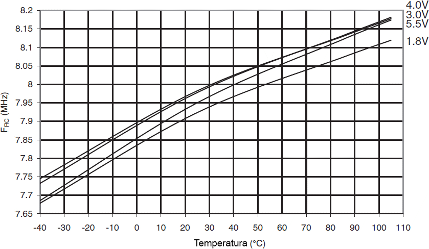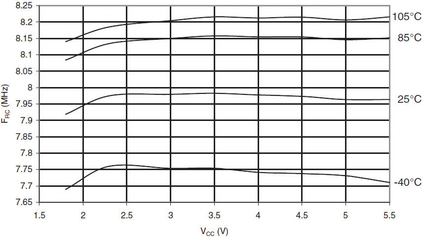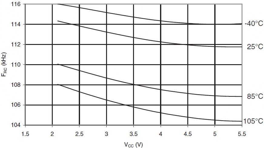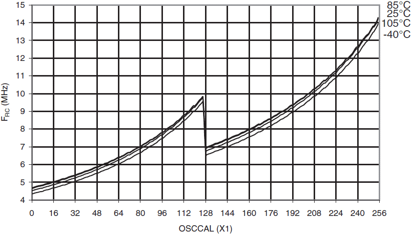 Rys.85 ATmega48PA: Częstotliwość kalibrowanego oscylatora RC