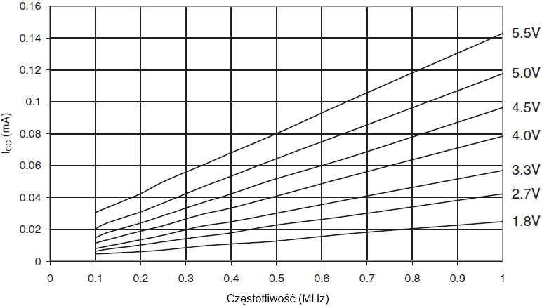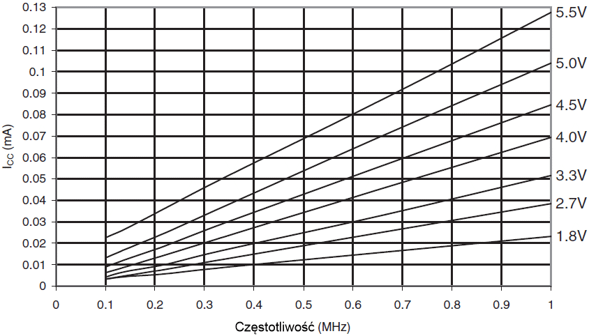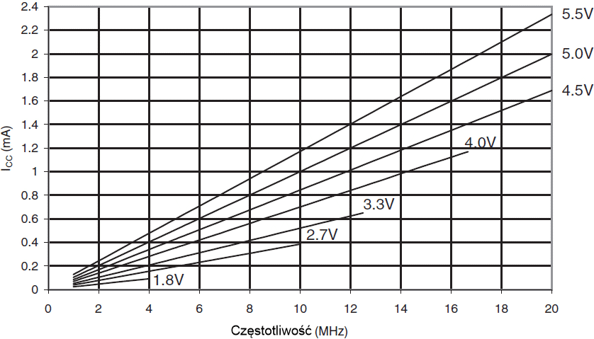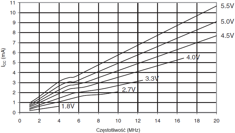 ![]() gdzie: CL = obciążająca pojemność VCC = napięcie robocze f = średnia częstotliwość przełączania końcówki we/wy |