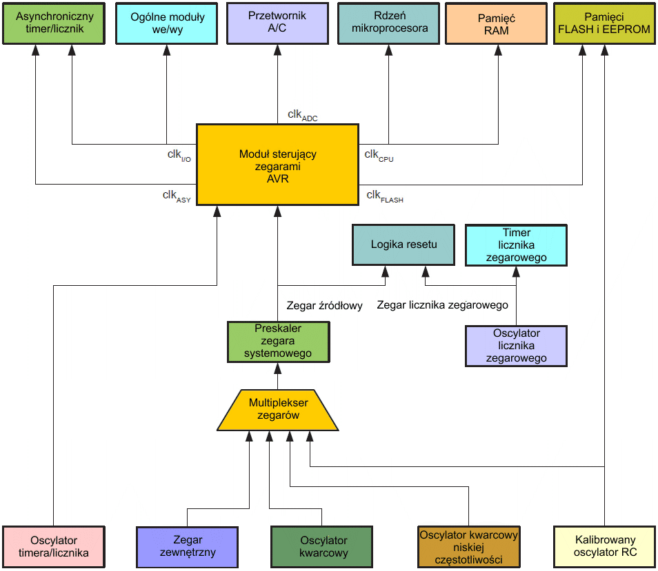 Powyższy rysunek z poprzedniego rozdziału przedstawia różne systemy zegarowe w mikrokontrolerze ATmega128 i ich dystrybucję. Rysunek jest pomocny przy wyborze odpowiedniego trybu uśpienia. Tabela poniżej wymienia różne tryby uśpienia i ich źródła wybudzeń.