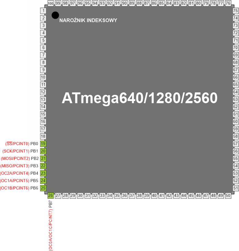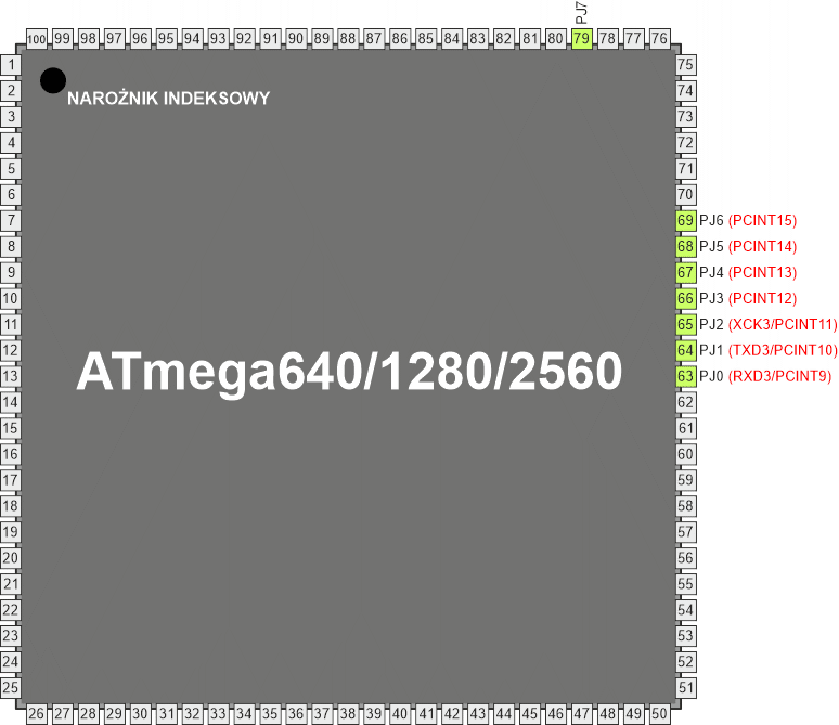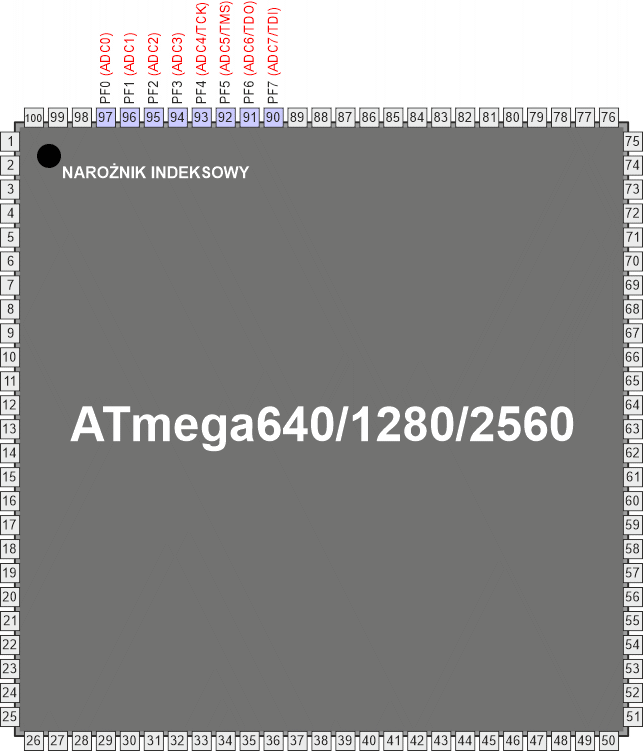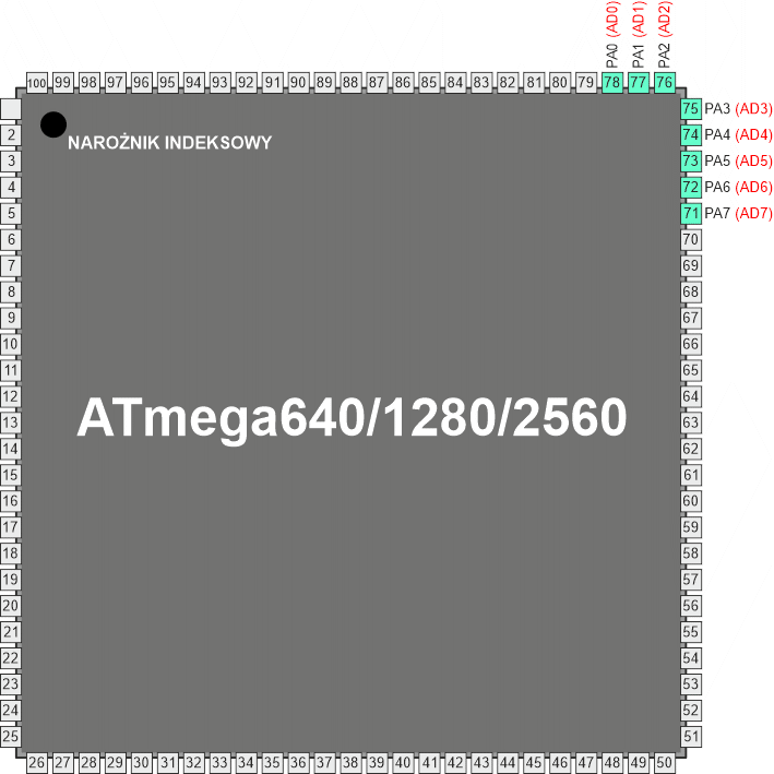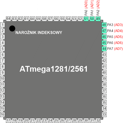 Port K dostępny jest tylko dla mikrokontrolerów ATmega640/1280/2560 w obudowach 100-nóżkowych.