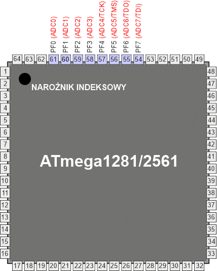 | PK4 | ADC12/PCINT20 (Kanał wejściowy 12 przetwornika A/C lub przerwanie 20 od zmiany stanu końcówki) |