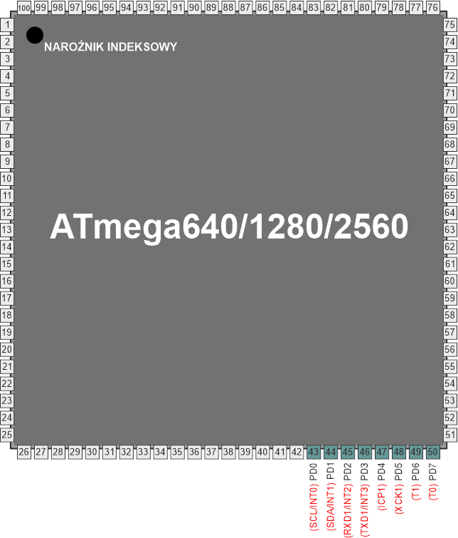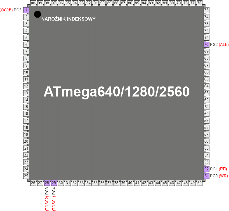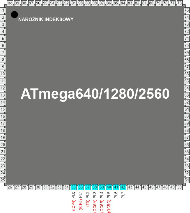 Port L dostępny jest tylko dla mikrokontrolerów ATmega640/1280/2560 w obudowach 100-nóżkowych.
