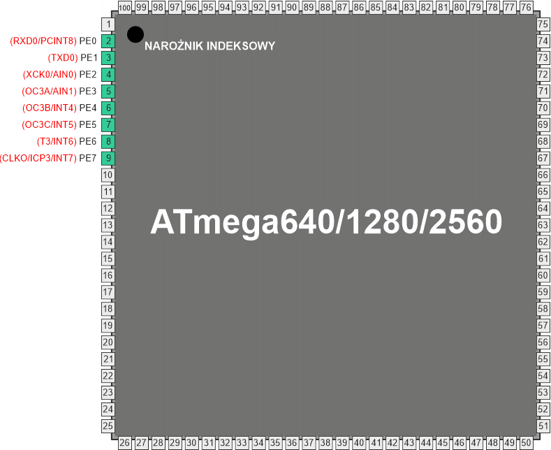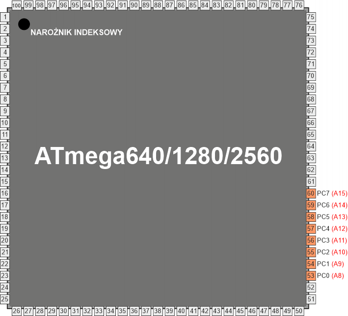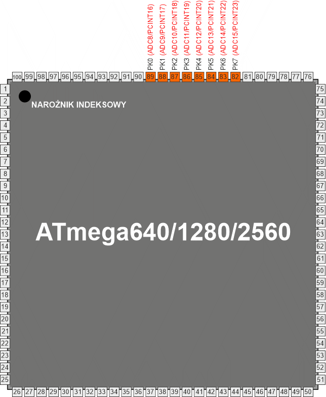 | PK0 | ADC8/PCINT16 (Kanał wejściowy 8 przetwornika A/C lub przerwanie 16 od zmiany stanu końcówki) |