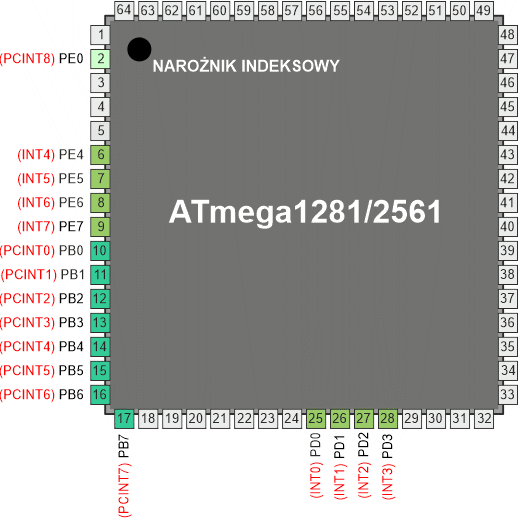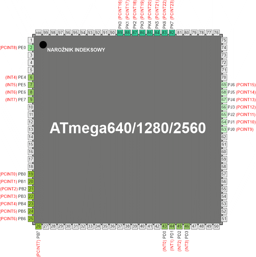 Każdy z bitów PCINT[23:16] uaktywnia przerwanie od zmiany stanu logicznego na odpowiadającej mu końcówce we/wy. Jeśli bit jest ustawiony, to przerwanie jest aktywne. Jeśli bit jest wyzerowany, to przerwanie jest wyłączone.
