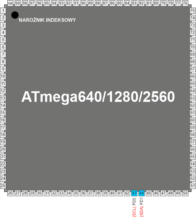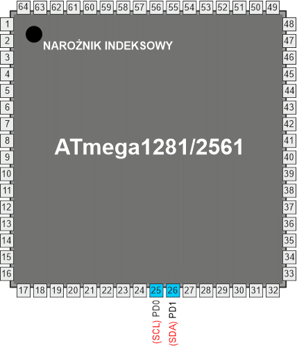 Te końcówki pośredniczą pomiędzy modułem AVR TWI a resztą systemu mikrokontrolerowego. Drajwery wyjściowe zawierają ogranicznik szybkości narastania zbocza sygnału, aby podporządkować się specyfikacji TWI. Stopnie wejściowe zawierają tłumienie impulsów szpilkowych krótszych niż 50 ns. Zwróć uwagę, że wewnętrzne oporniki podciągające można uaktywnić przez ustawienie bitów rejestru PORT odpowiadających końcówkom SCL i SDA, co jest wyjaśnione w rozdziale "Porty we/wy". Wewnętrzne oporniki podciągające mogą w niektórych systemach wyeliminować potrzebę stosowania zewnętrznych.