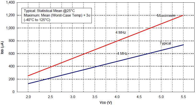 Uwaga: Wykresy i tabele poniżej tej uwagi są statystycznym podsumowaniem opartym na ograniczonej liczbie próbek i służą jedynie dla celów informacyjnych. Stąd charakterystyki pracy mikrokontrolera nie są ani testowane, ani gwarantowane. Na niektórych wykresach lub w tabelach przedstawione dane są spoza standardowego zakresu pracy (t.j. poza standardowym zakresem napięcia zasilania VDD). Są one podane jedynie dla informacji, a poprawna praca mikrokontrolera jest zapewniona tylko w standardowym zakresie parametrów. |