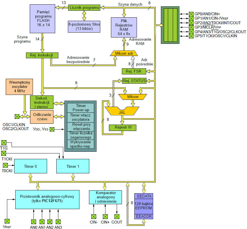 | Legenda: | Szare tło odnosi się tylko do mikrokontrolera PIC12F675 | |