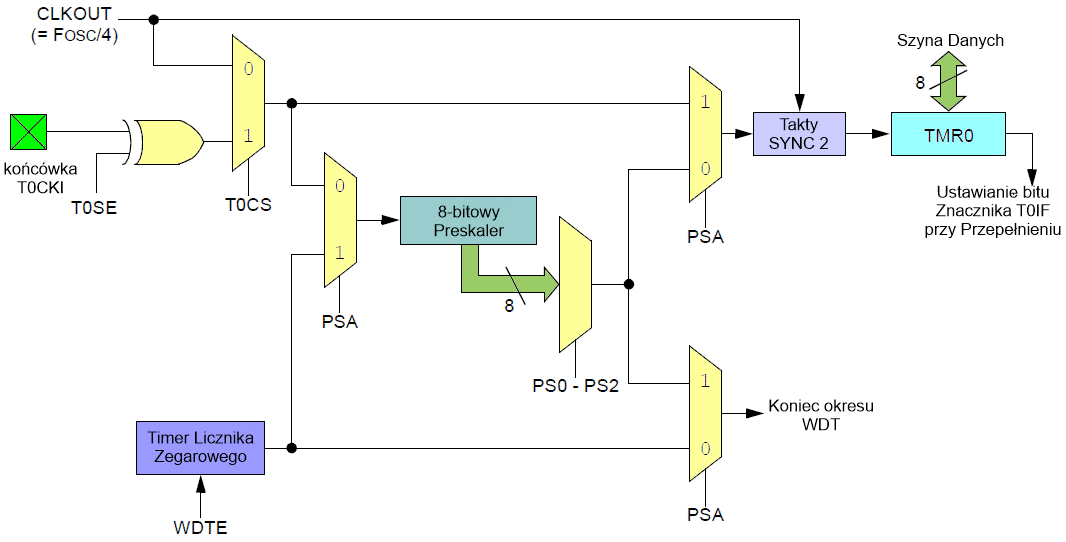 | Uwaga: | T0SE, T0CS, PSA, PS0-PS2 są bitami rejestru OPTION_REG. |