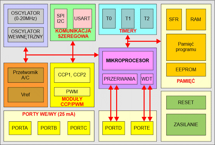 Procesor PIC składa się ze standardowych modułów: