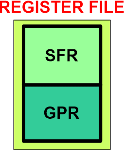 Rejestry SFR i GPR znajdują się we wspólnej przestrzeni danych, zwanej plikiem rejestrów (ang. Register File). Takie rozwiązanie pozwala na dostęp do SFR i GPR przy pomocy tych samych instrukcji mikroprocesora.