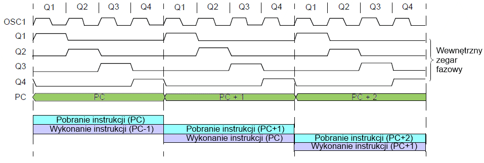 Każdy cykl rozkazowy (Tcy) złożony jest z czterech taktów Q (Q1-Q4). Takt Q jest taki sam jak takt oscylatora mikrokontrolera (TOSC). Takty Q wyznaczają w każdym cyklu rozkazowym okresy dekodowania, odczytu, przetwarzania danych, zapisu, itp. Poniższy wykres pokazuje związek taktów Q z cyklem rozkazowym. Ogólnie cztery takty Q w cyklu rozkazowym można podzielić na: